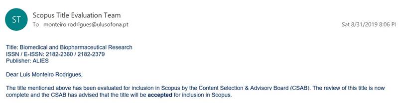 A equipa de Avaliação Scopus informou-nos recentemente que a BBR/JIBB foi aceite para inclusão na SCOPUS (Elsevier), um dos bancos de dados científicos mais importantes do mundo. Um passo enorme para a BBR e um sinal muito positivo para o nosso trabalho e motivação, bem como a responsabilidade de manter e, se possível, melhorar nossos padrões de qualidade.