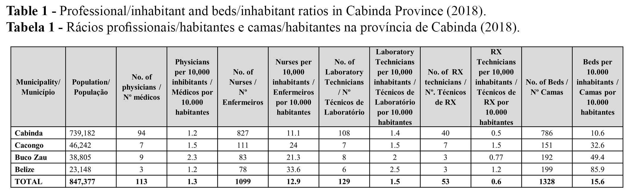 If we consider primary health care the basis for the provision of health services and the main route of access to the health system, the professional/inhabitants deficit ratio can be a critical point for materializing the Municipalization of Services strategy. It should be noted that the estimated population that these studied units serve is around 801,374, and some units, despite being located in the main city (Cabinda), due to their specificity, meet a provincial demand (Ex. Tuberculosis, HIV / AIDS, Physiotherapy, Technical Exams Cardiology). Thus, it is complex to define the proportion of care needs in urban/suburban and rural areas.