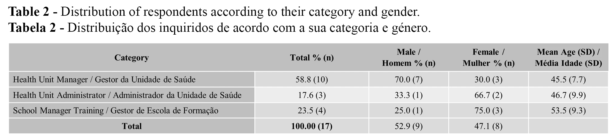 Seventeen individuals have completed the survey. Most of them were Health unit managers (Table 2). The individuals’ ages varied between 33 and 66 years old. Training school managers had the highest mean age (53.5), compared with the other professionals.