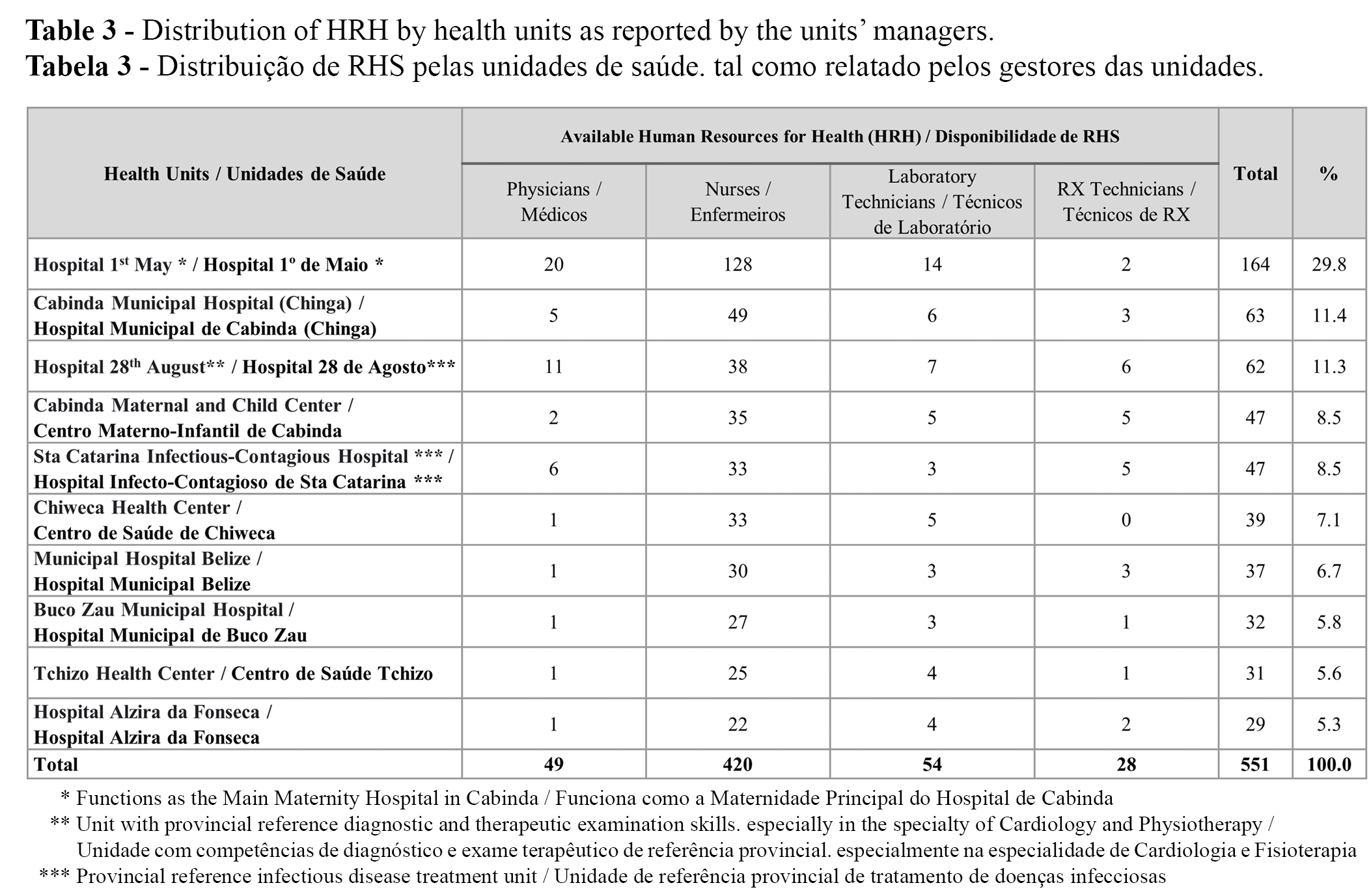 This exploratory study presents relevant data on the characterization and distribution of health professionals and managers of health units in the province of Cabinda.