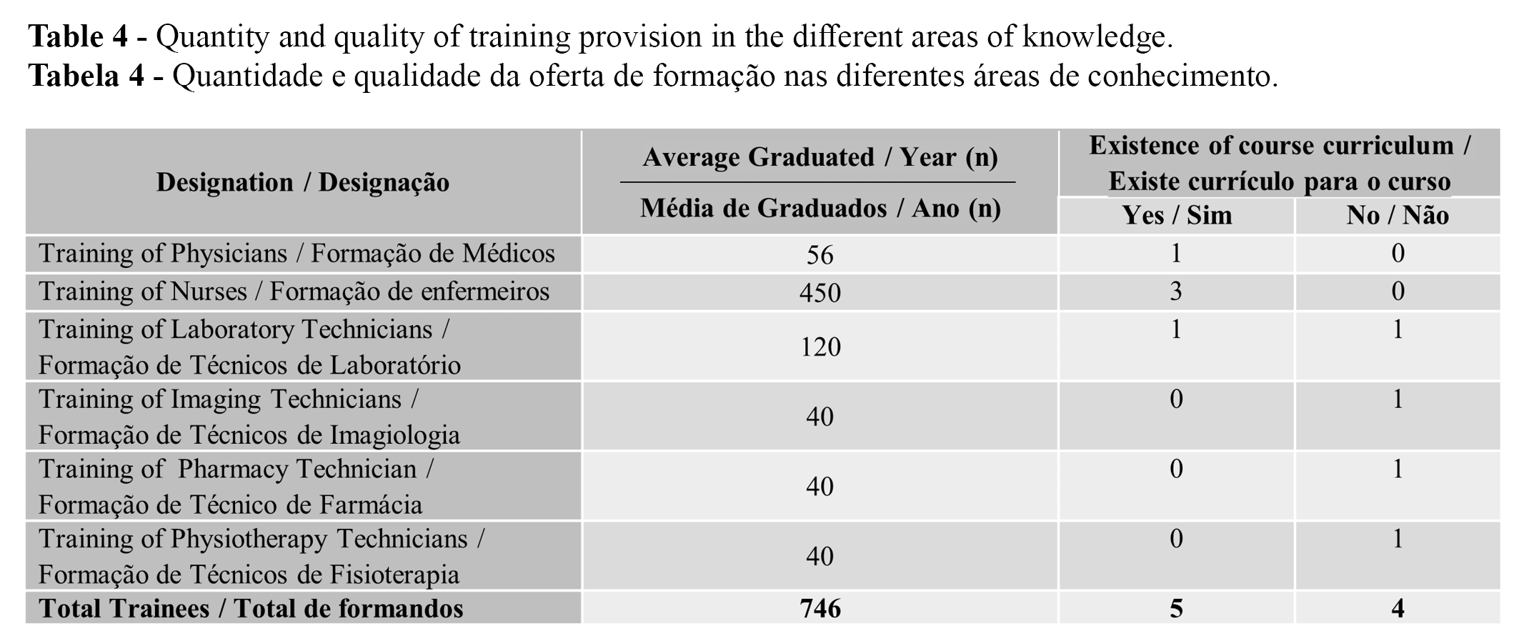 Regarding the training offer, the training schools trained about 746 senior and middle technicians in one year (referring to 2017). These figures reveal the local capacity to carry out initial training at both the middle and higher levels is installed. However, healthcare units managers emphasize the lack of technical and technological resources, deficient tutorial teaching, and weak knowledge of theoretical and practical concepts. These deficits are evidenced by those who work in units and also, by the managers of training units, regarding the curricular quality of the courses, teacher profile, teaching support in the practical field and rigor in the evaluation of students. All these findings reflect the published evidence (4), which means that few steps have been taken or that the implemented measures have not been successful.