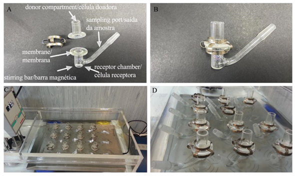 | Figure 2 - Representation of the Franz cell diffusion system: A) Parts of the cell; B) Cell arranged for use; C and D) Cells in a 37oC water bath. |