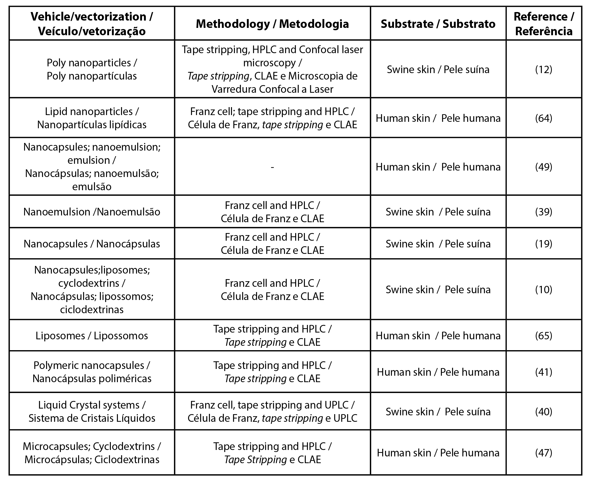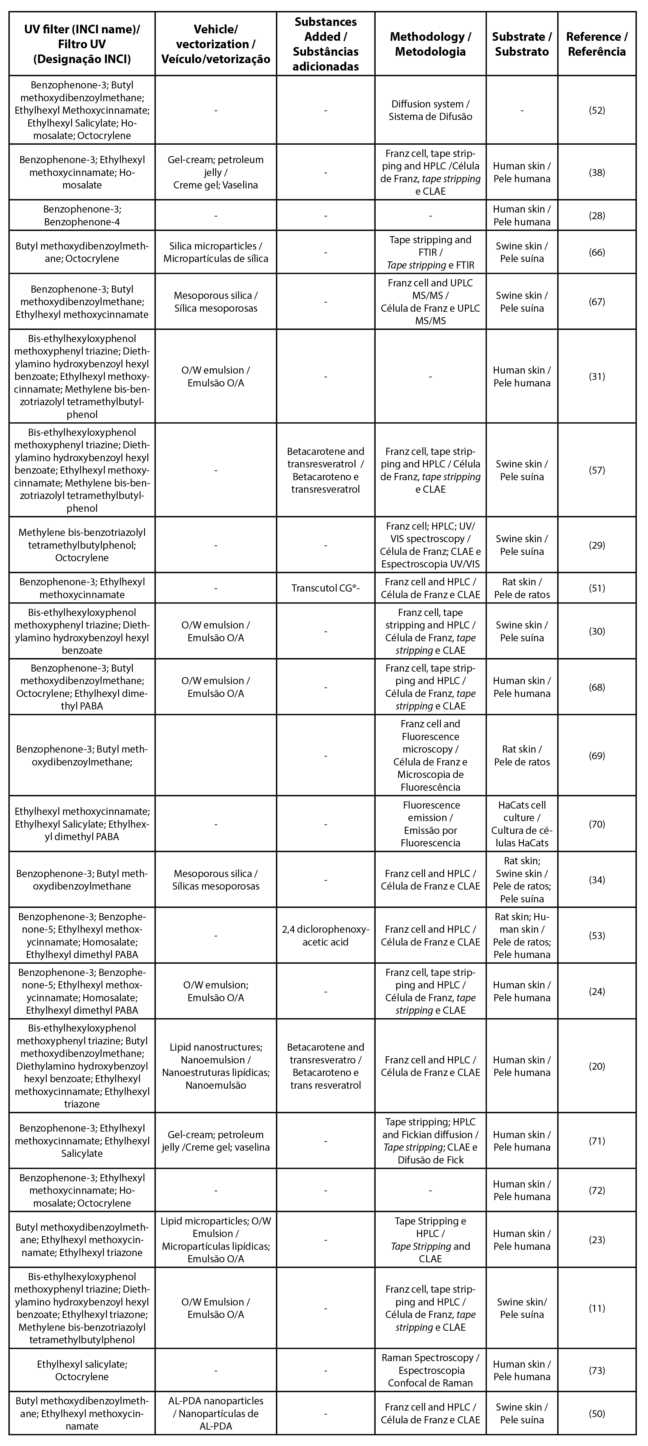 The articles were analyzed in relation to the methodology used to evaluate the penetration and/or permeation of sunscreens on the skin, regarding the substrate used as a model for analysis and for the results presented.