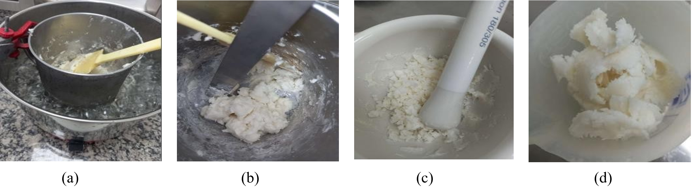 | Figure 1 - A mixture of sodium isethionate and cocoamidopropyl betaine. (a) The image shows the heating performed in a water bath. (b) Paste formation of sodium isethionate and cocoamidopropyl betaine. (c) Paste of sodium isethionate and cocoamidopropyl betaine being milled. (d) Paste after shredding. |