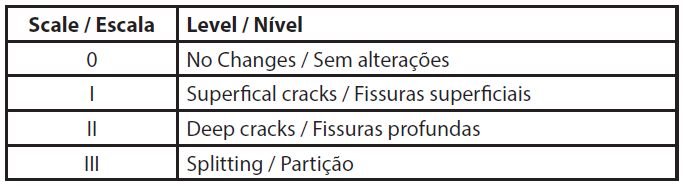 | Tabela 2 - Scale for evaluating cracks (8). |