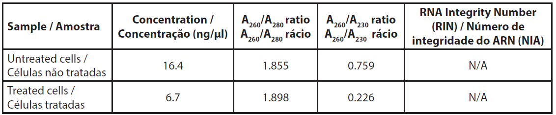 A quantidade de ARN total extraído de cerca de 4,5x106 células foi baixa e não nos permitiu medir o perfil de ARN (Tabela 3). Os rácios A260/A230 eram muito baixos, indicando uma proporção relativamente elevada de sais nas amostras, mas a razão foi a quantidade muito baixa de ARN e não uma quantidade inesperada de sais após a extração.