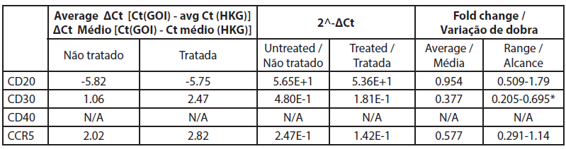 A análise da expressão genética por qRT-PCR mostrou que o CD40 não foi expresso em células não tratadas e em células tratadas com extrato de rosa com valores de Ct superiores a 32 (Tabela 5). Neste estudo os níveis de CD20 não foram significativamente alterados pelo tratamento com extrato de rosa. Todos os outros genes foram expressos e bem medidos tanto nas amostras de células B tratadas como nas não tratadas. Os valores de CT dos genes CD20 antes e depois do tratamento com extrato de rosa foram de -5,82 e -5,75, respetivamente, e a alteração média de fold foi de 0,95 (0,51-1,79) (não significativo).
